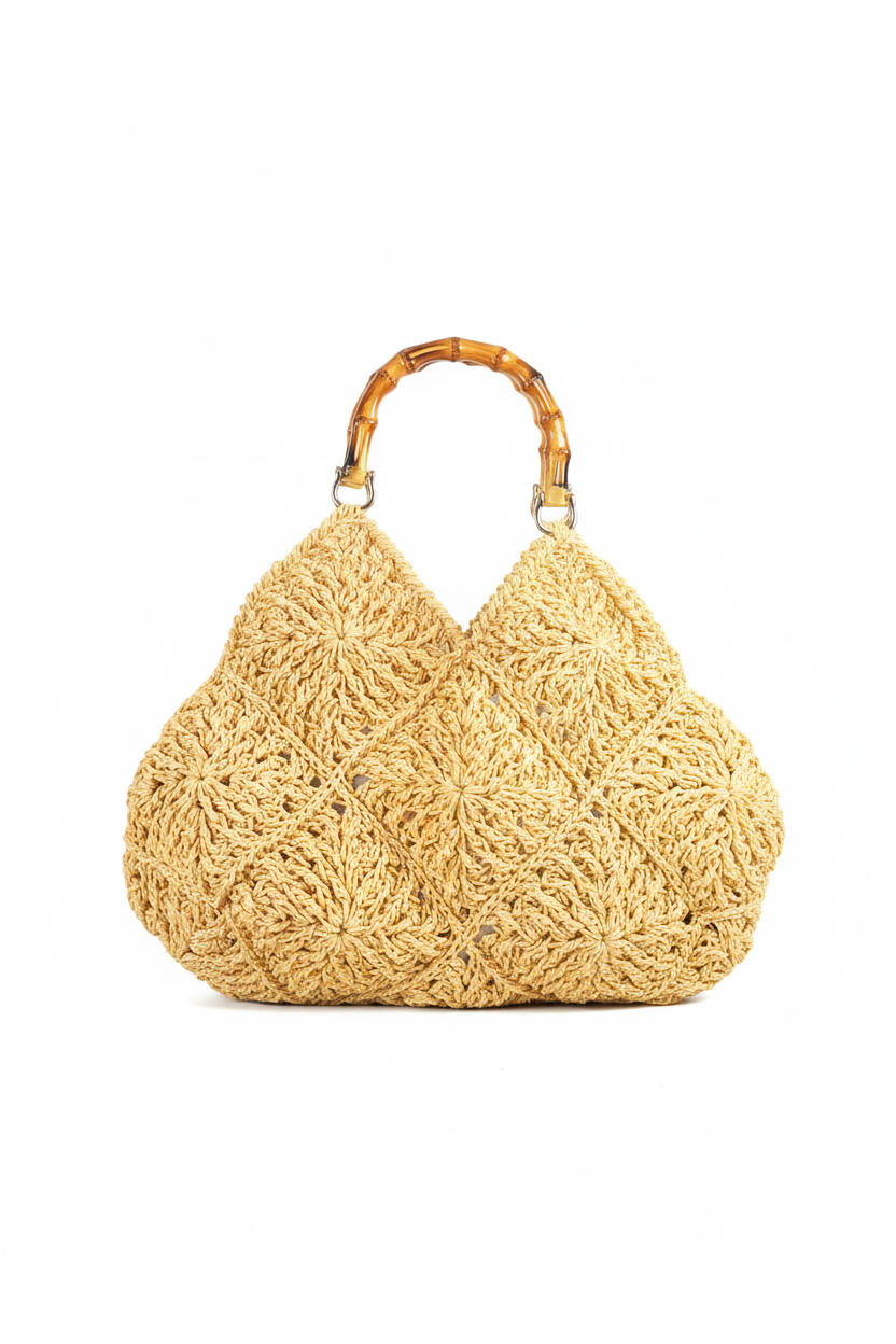 Bambu Saplı El Yapımı Örgü Çanta – Motifli Naturel Kadın Çantası