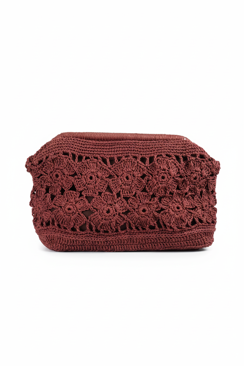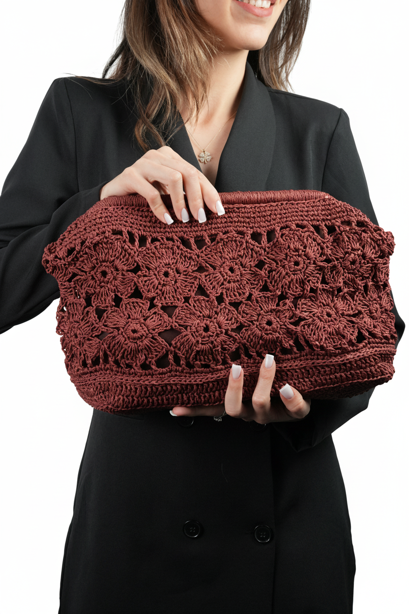 El Yapımı Çiçek Motifli Bordo Burslu Çanta
