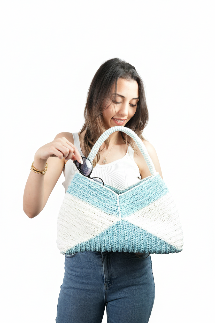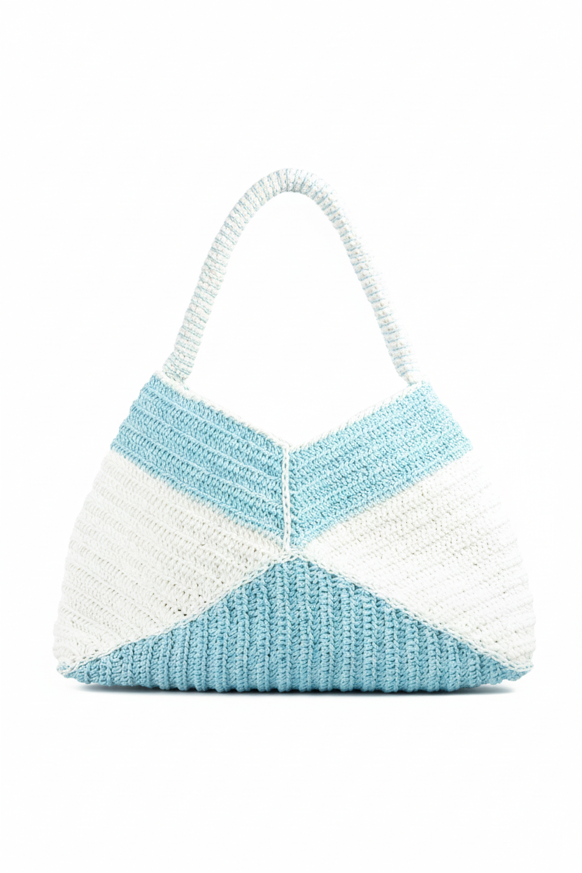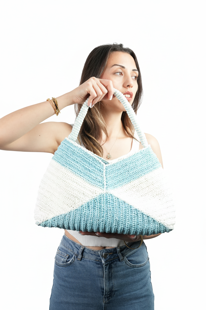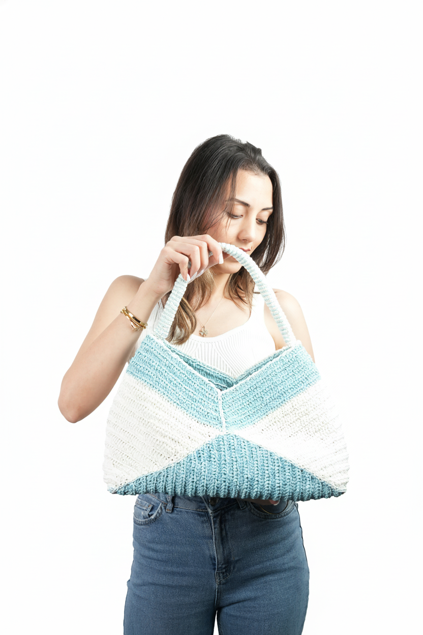 El Yapımı Örgü Omuz Çantası | Mavi & Beyaz Geometrik Tasarım