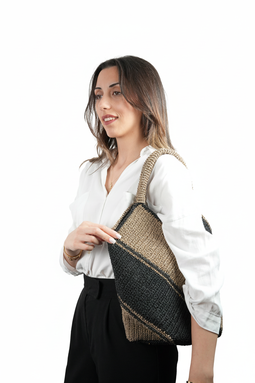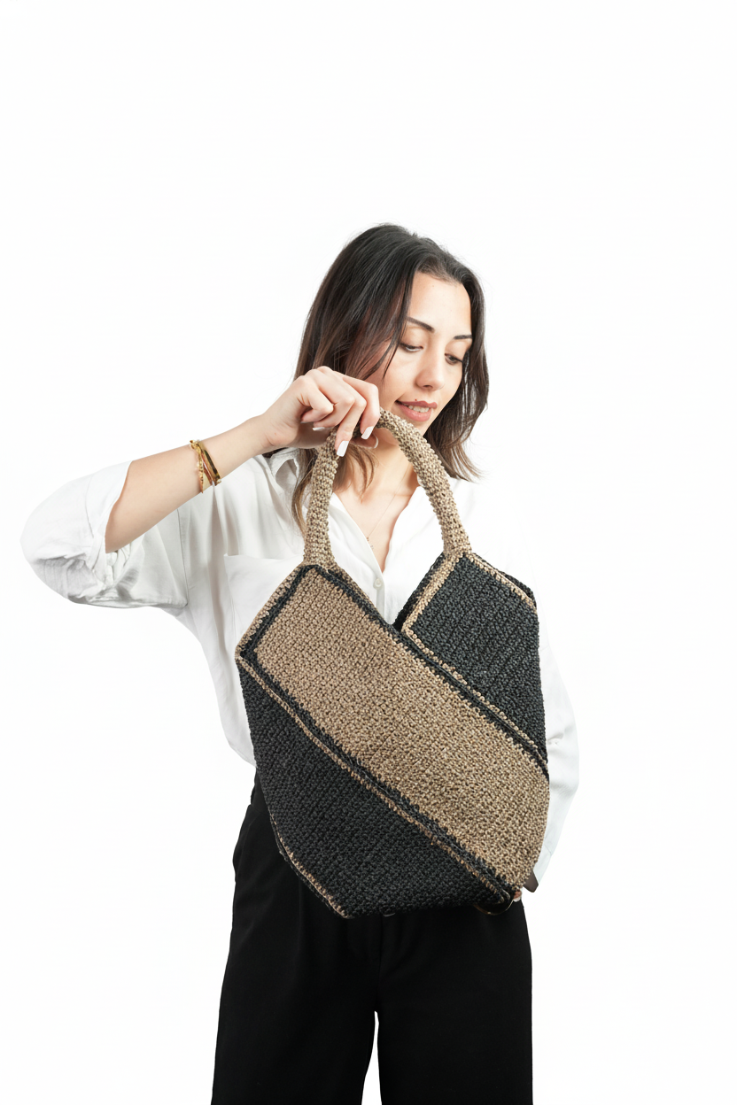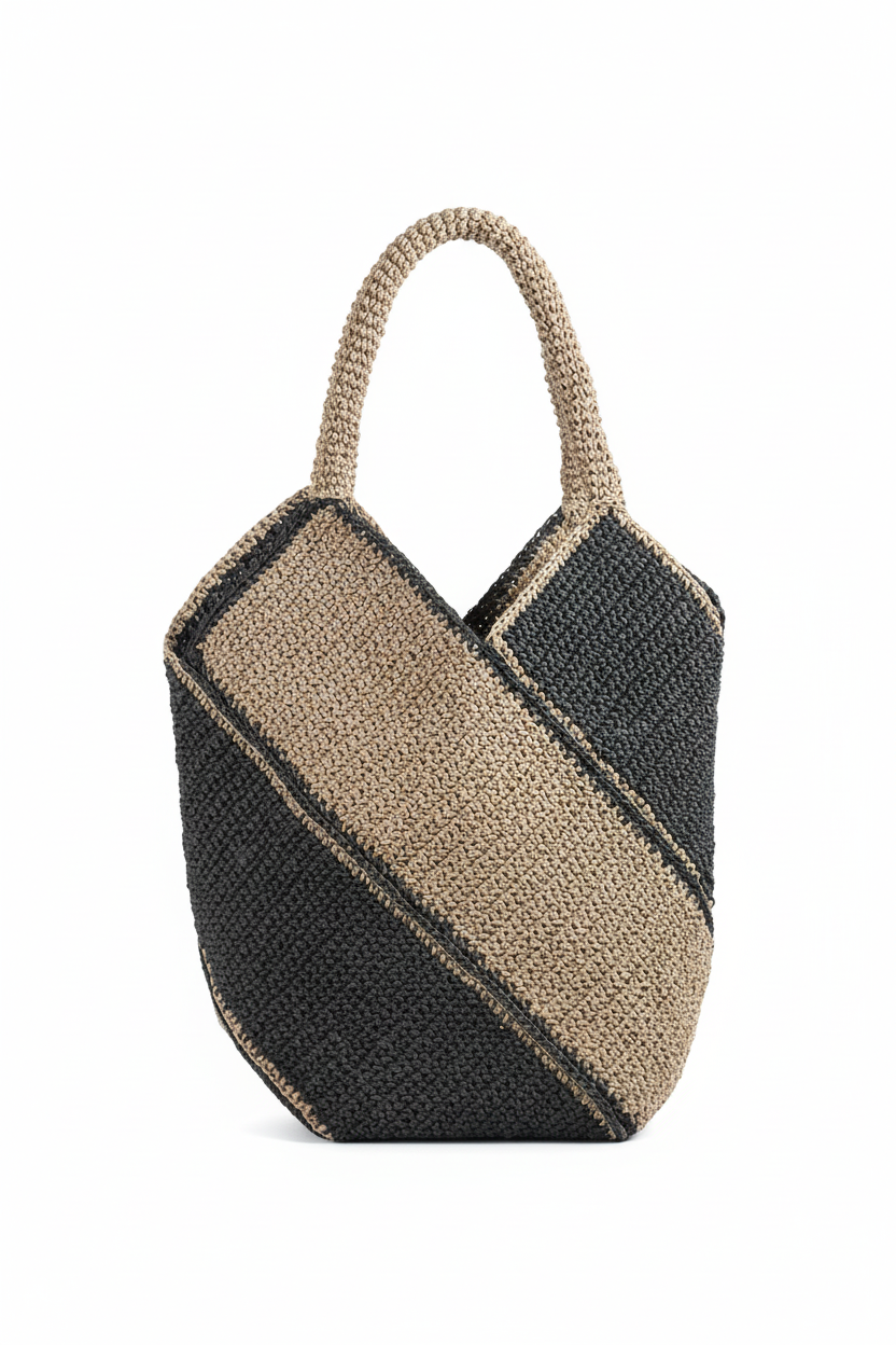 El Yapımı Örgü Tote Çanta | Diyagonal Renk Bloklu Bej & Siyah