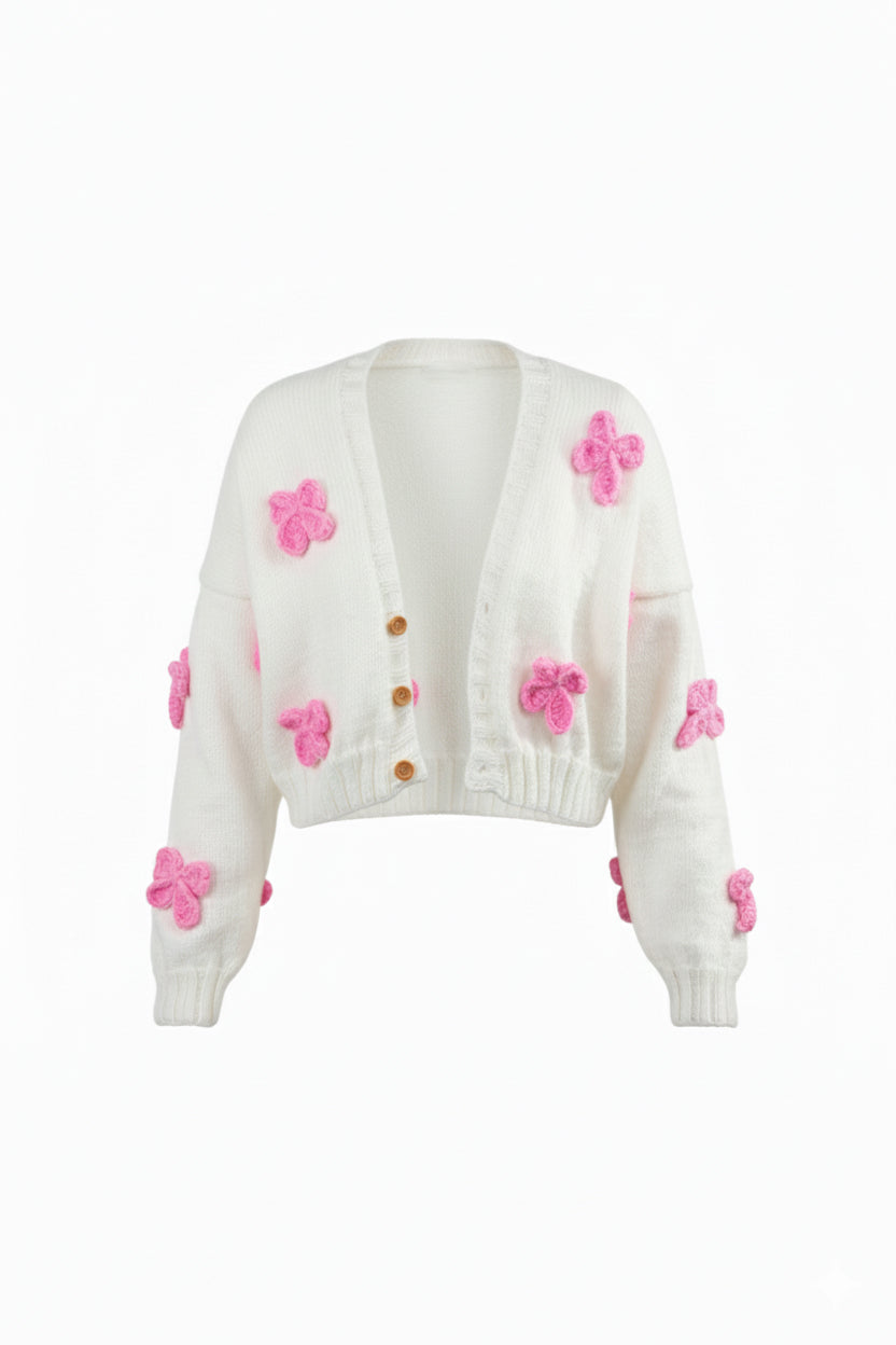 El Yapımı Pembe Kurdeleli Beyaz Crop Hırka