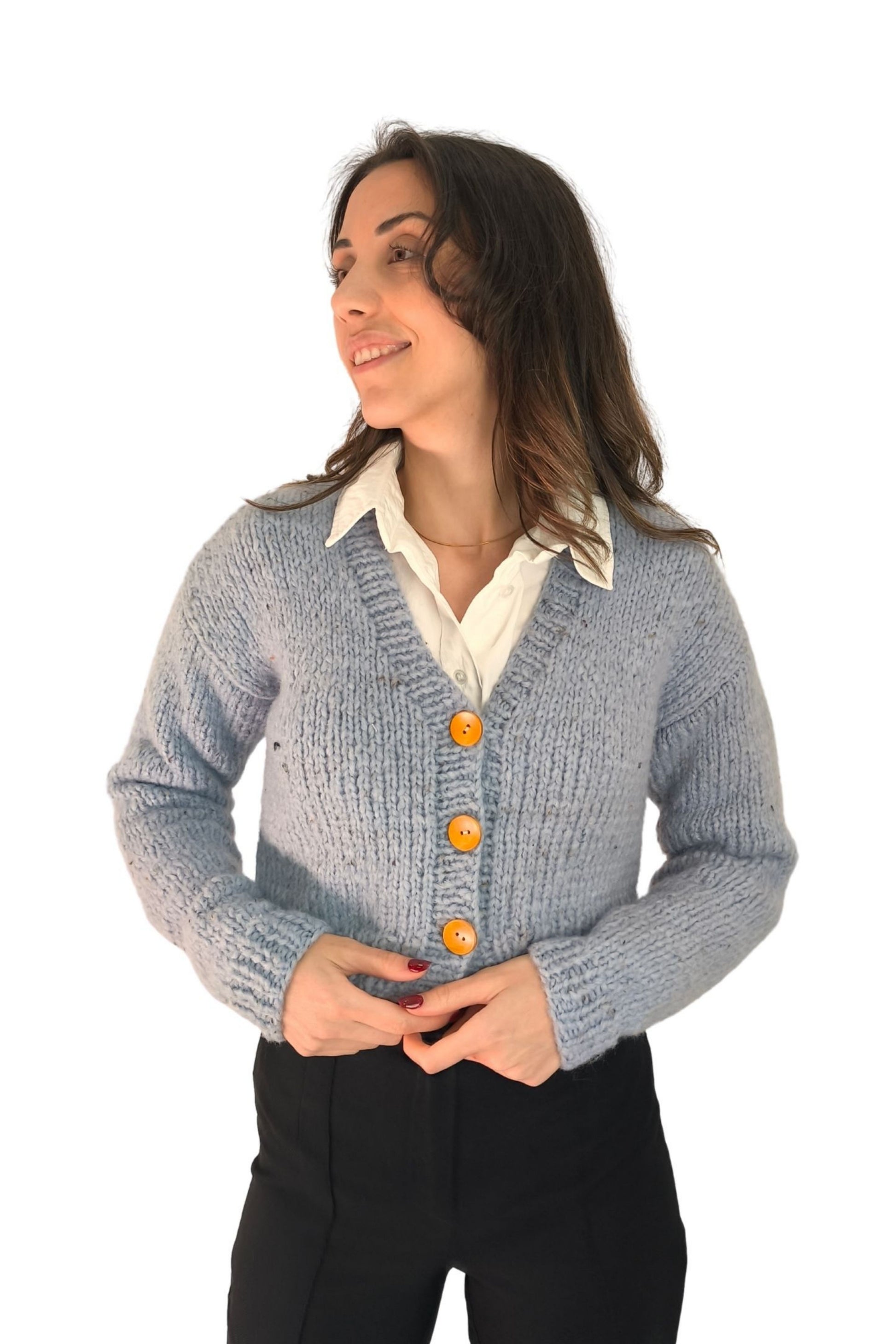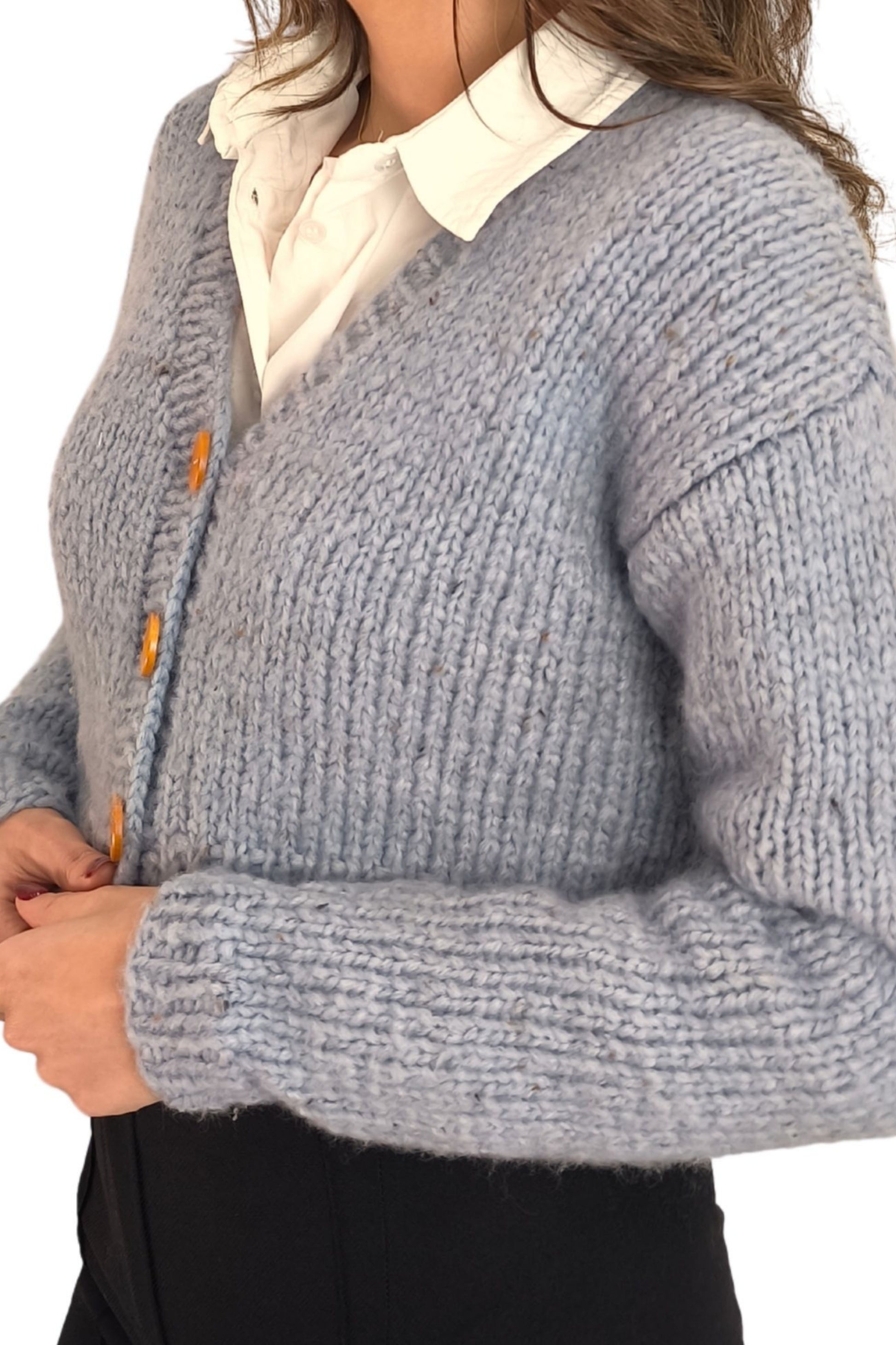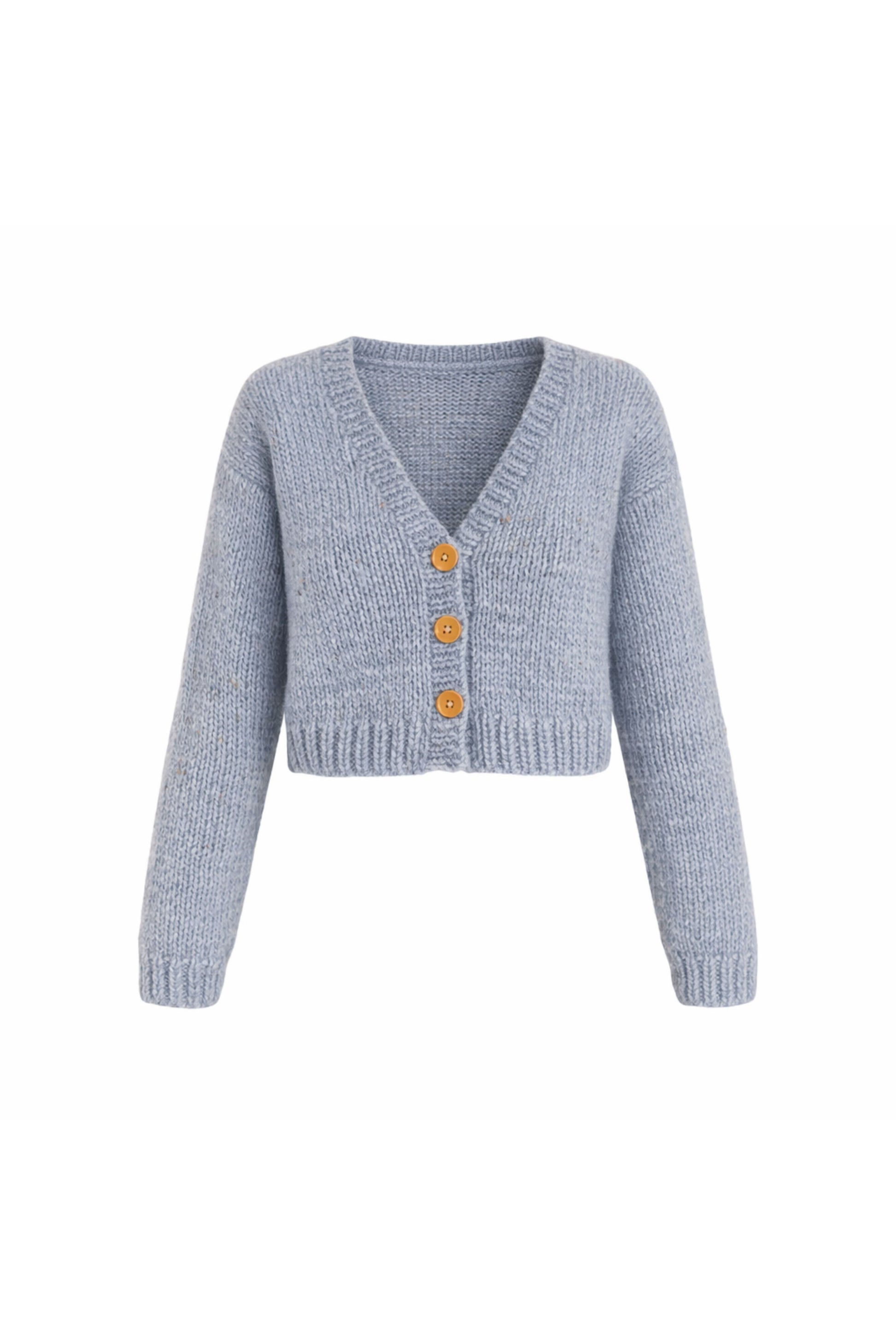 Gri El Örgüsü Crop Hırka – V Yaka Düğmeli Triko