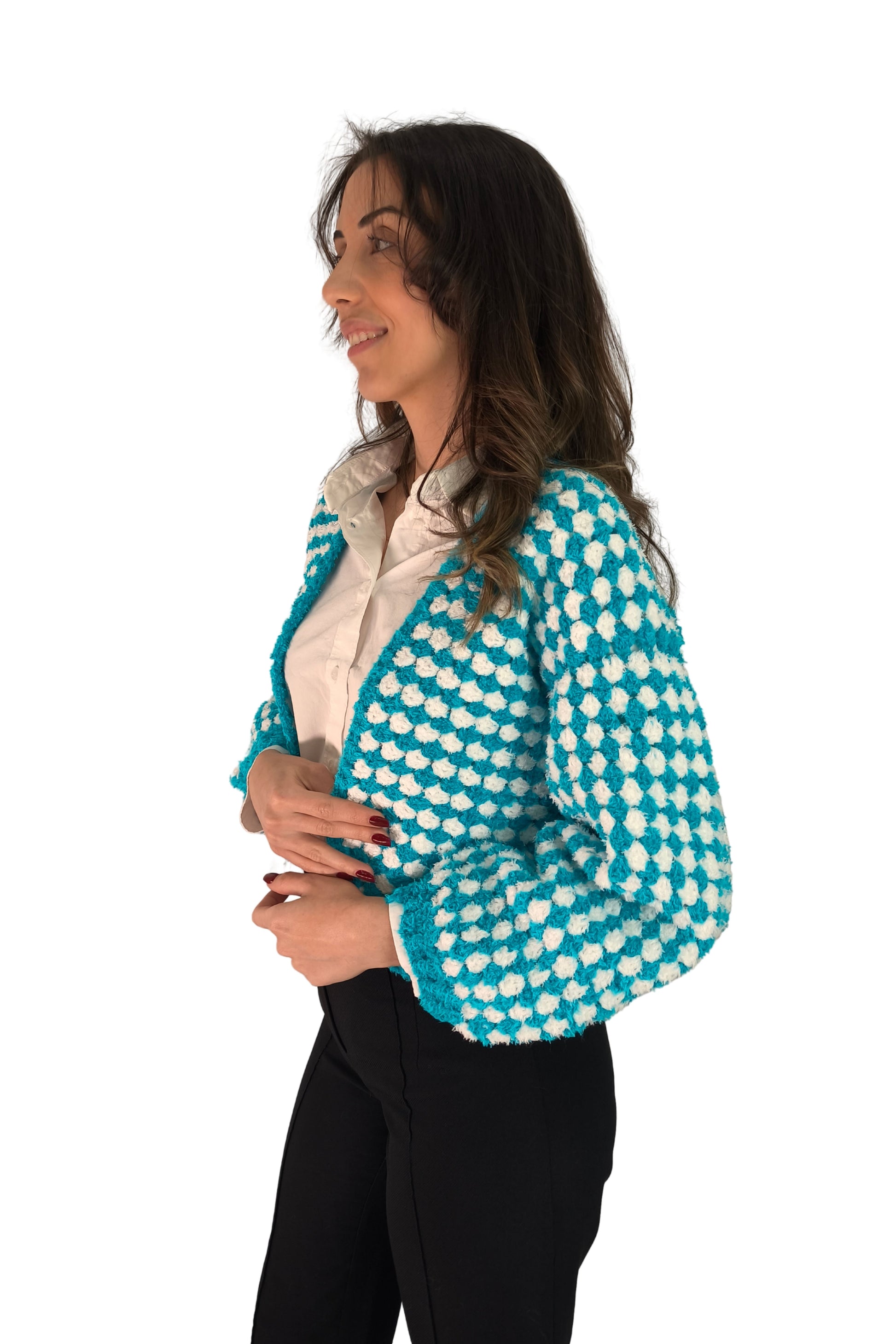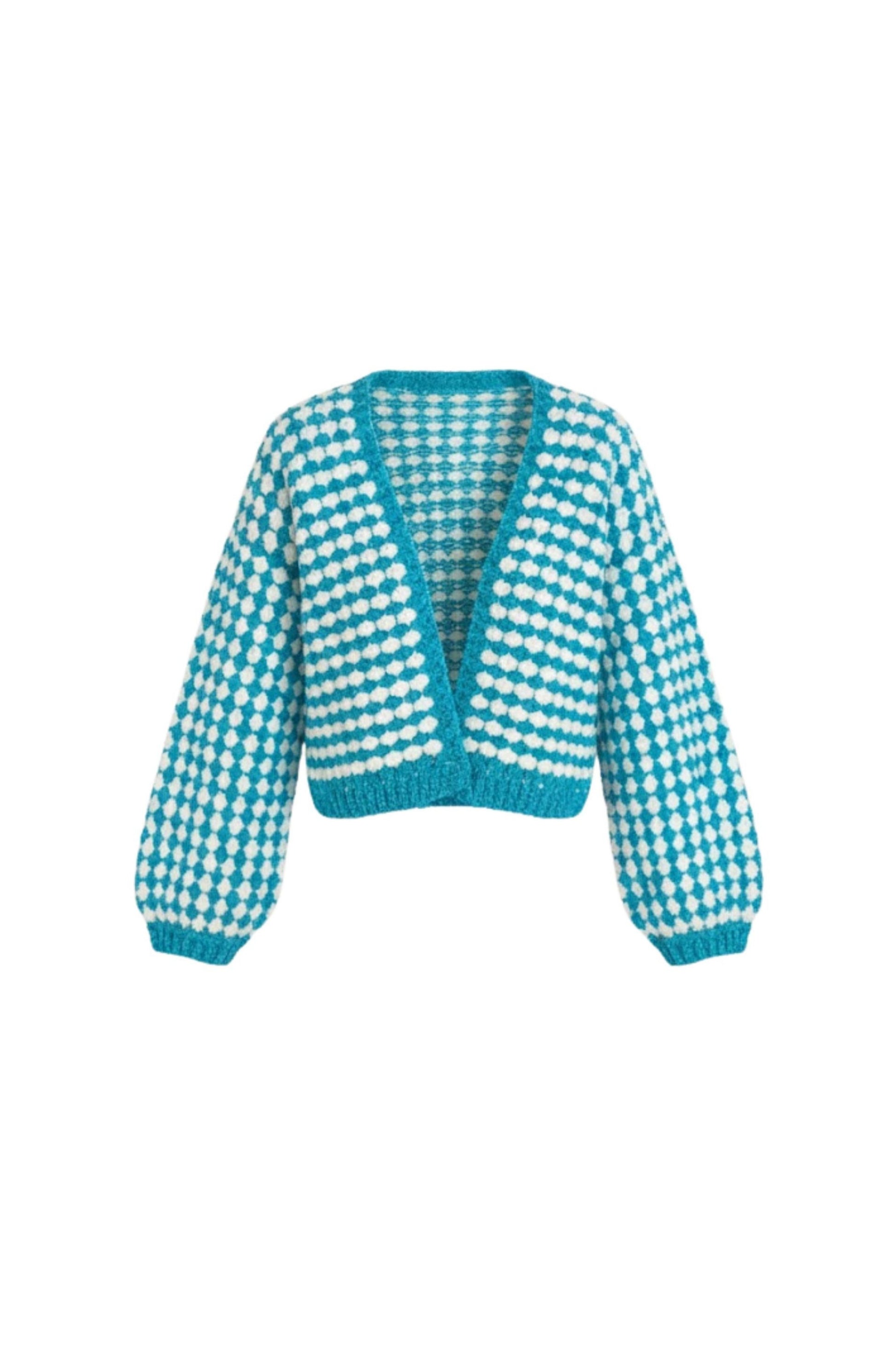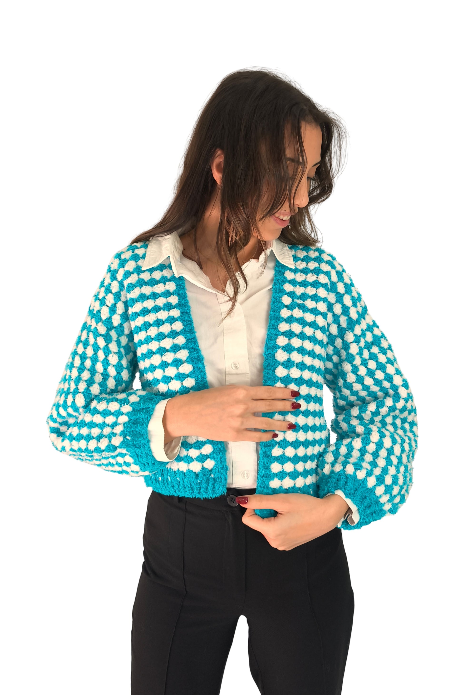 Kare Motifli Mavi Triko Hırka – Crop Kesim El Örgüsü Tasarım