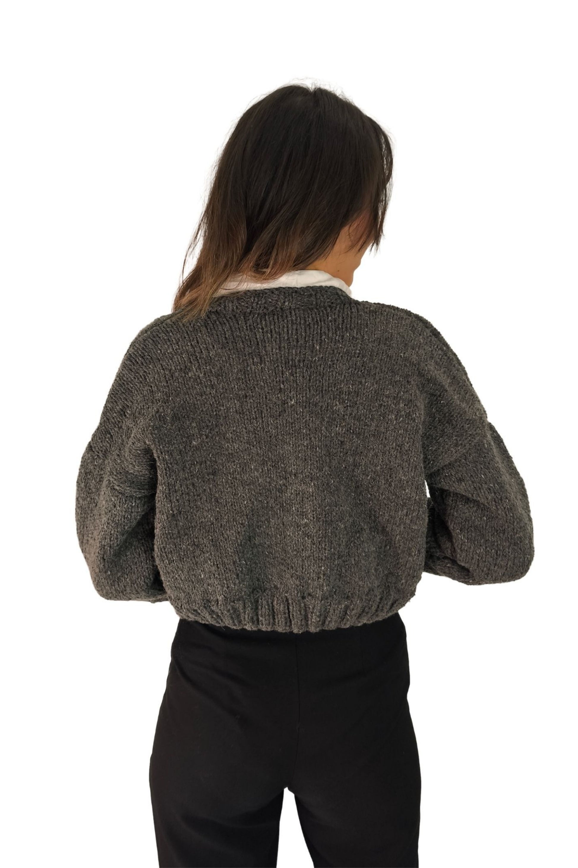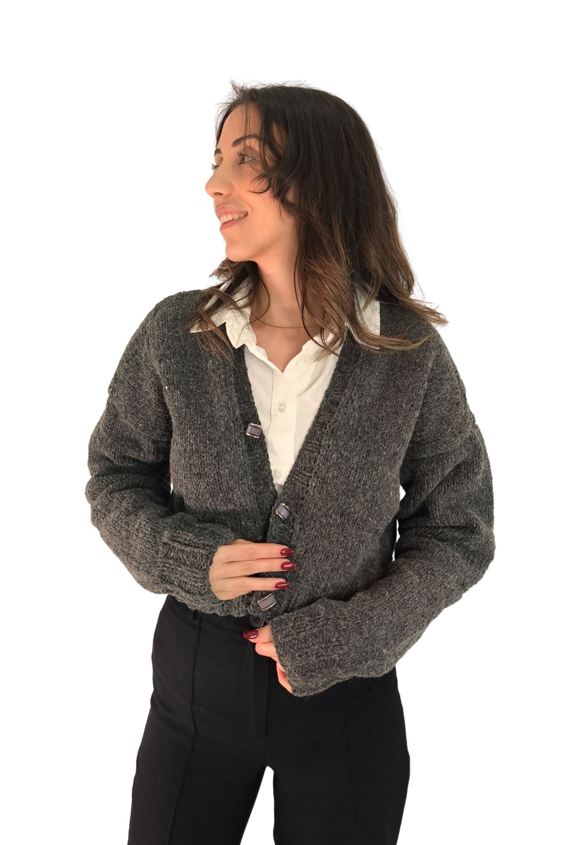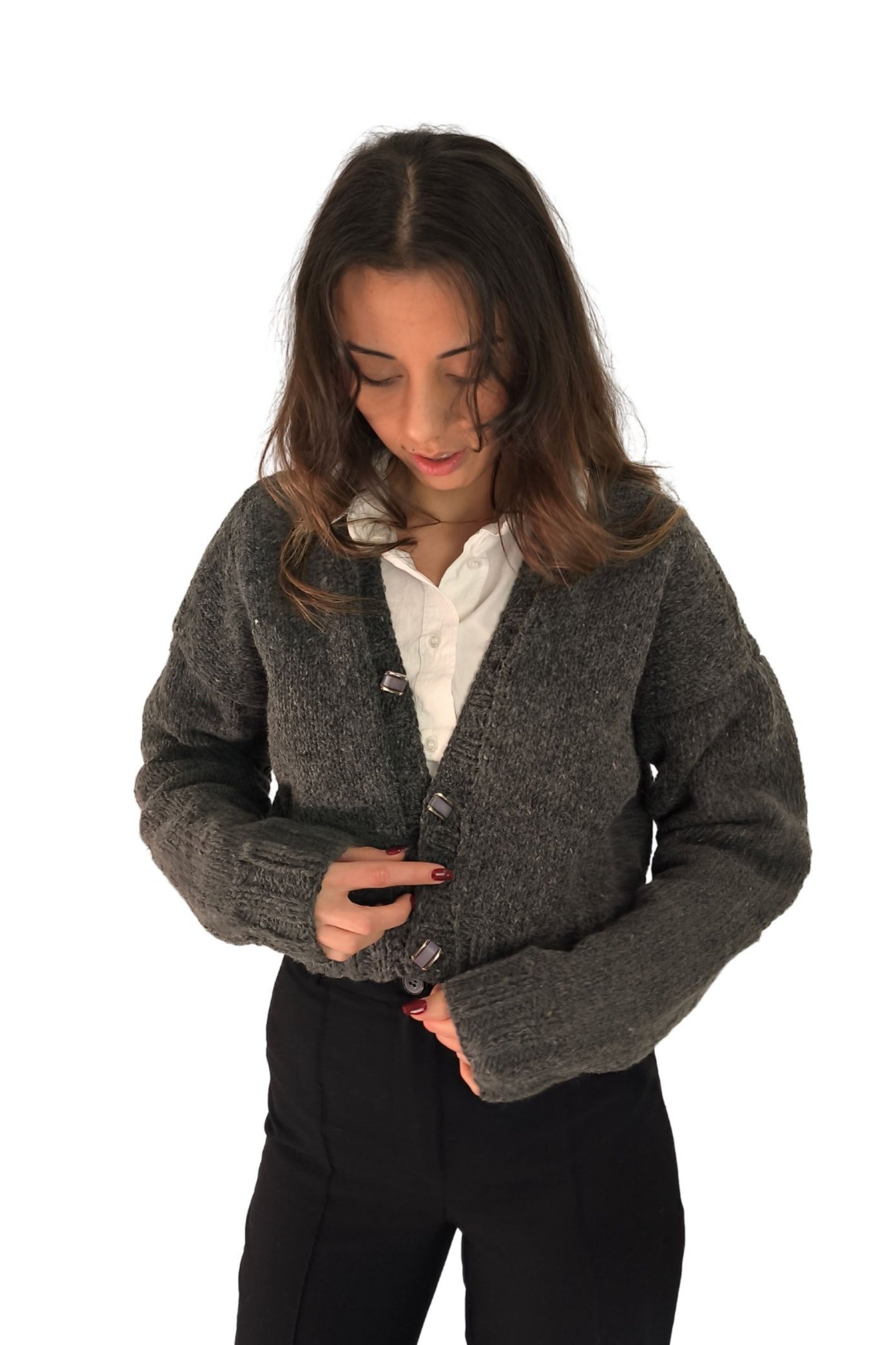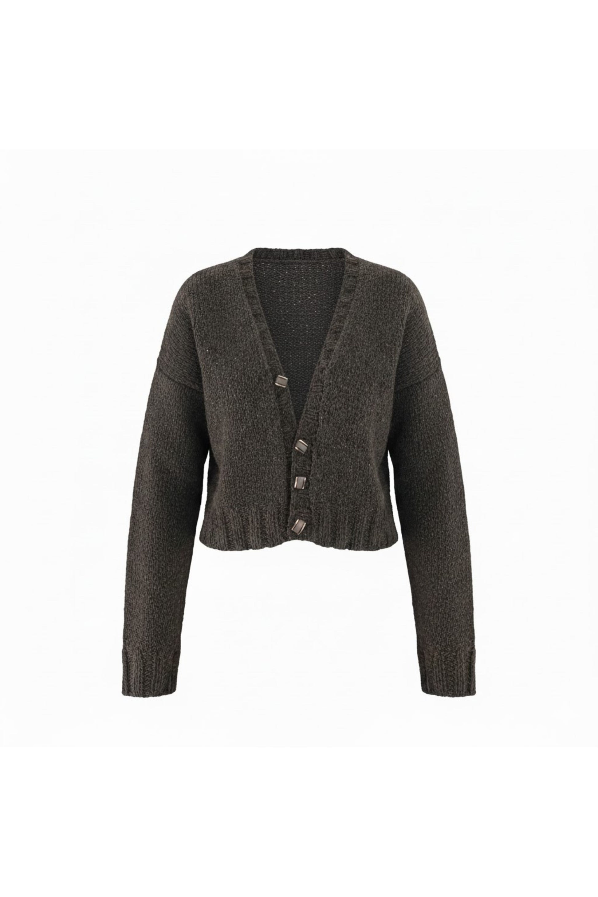 Koyu Gri Crop Triko Hırka – Düğmeli V Yaka Tasarım
