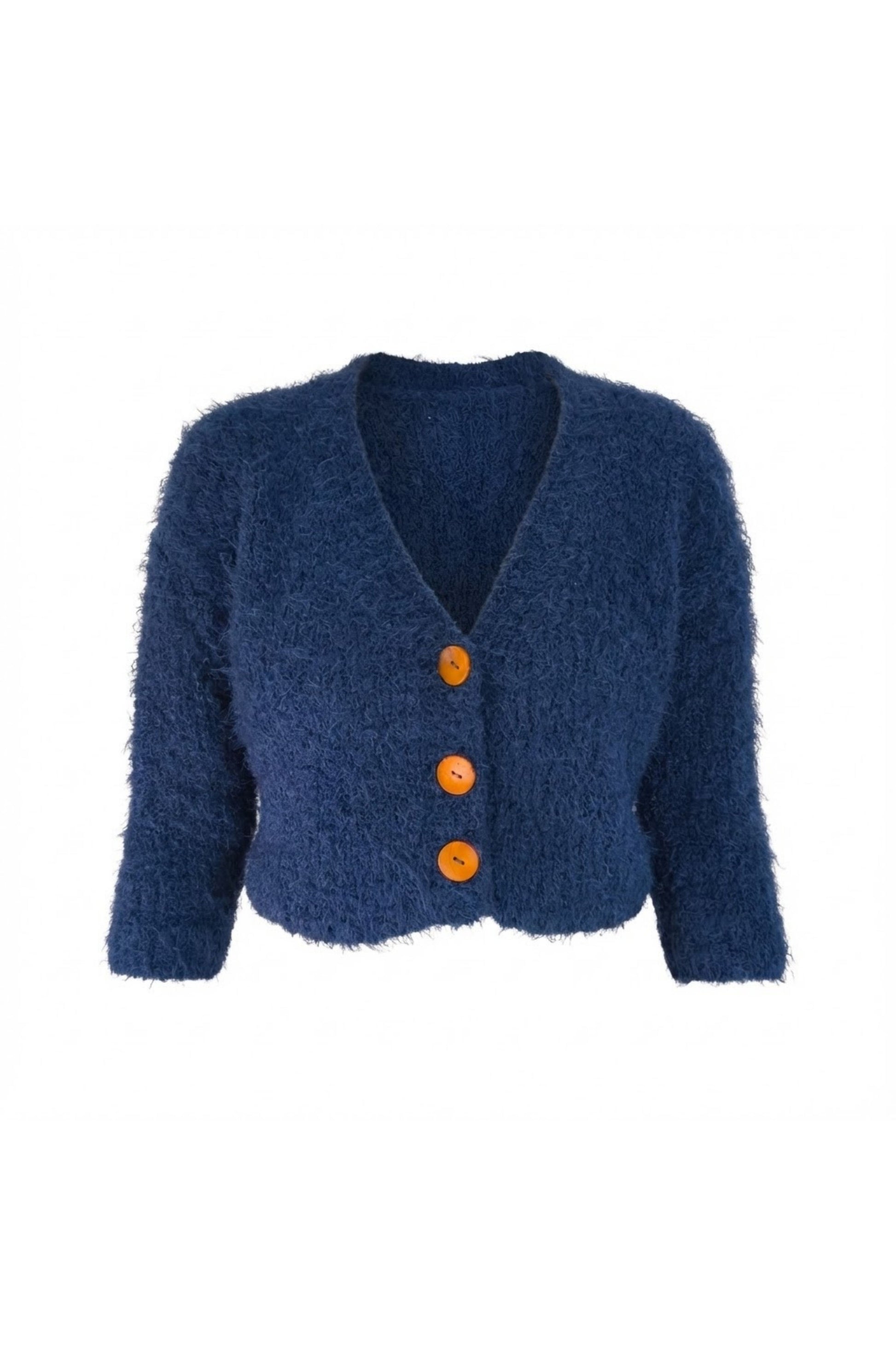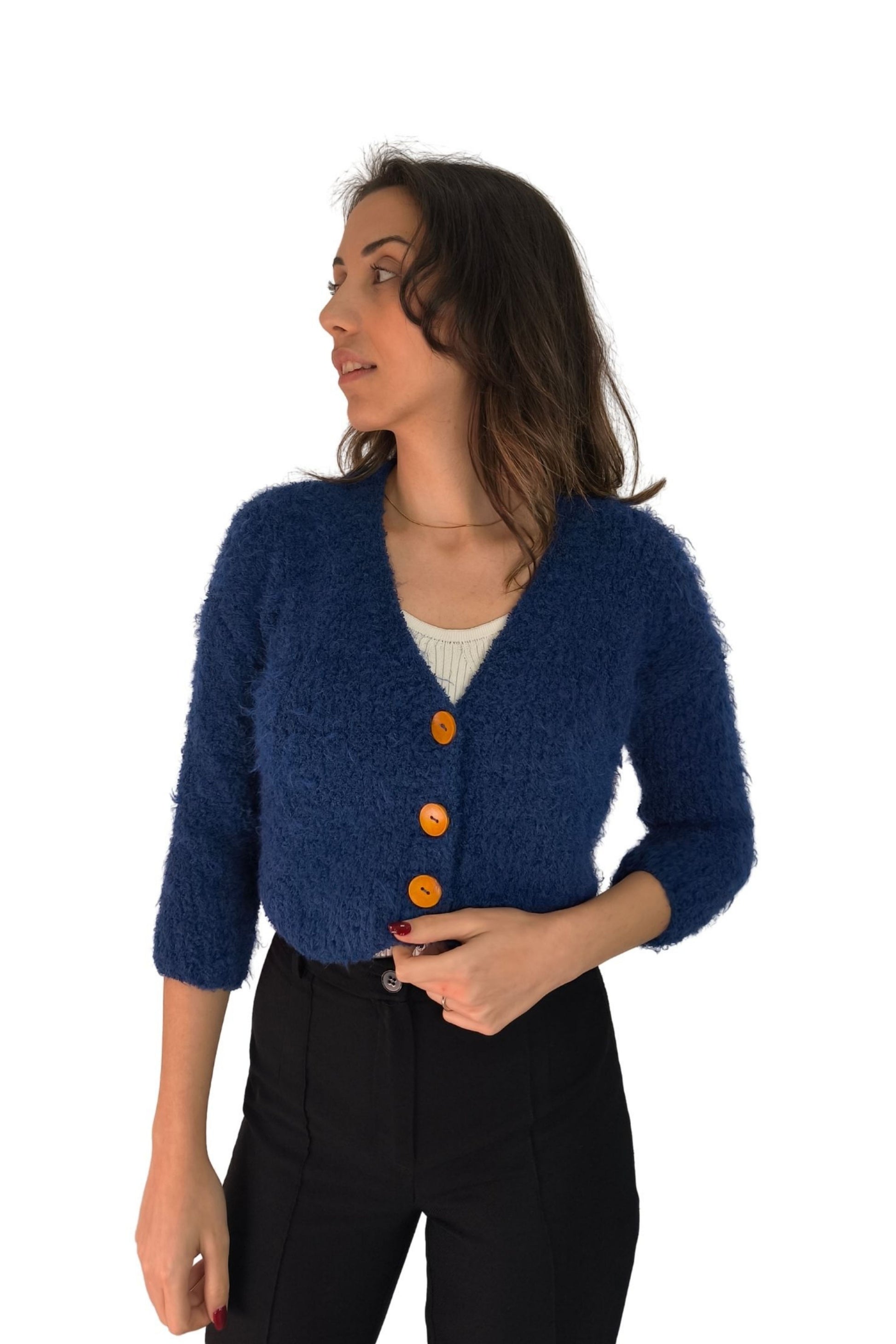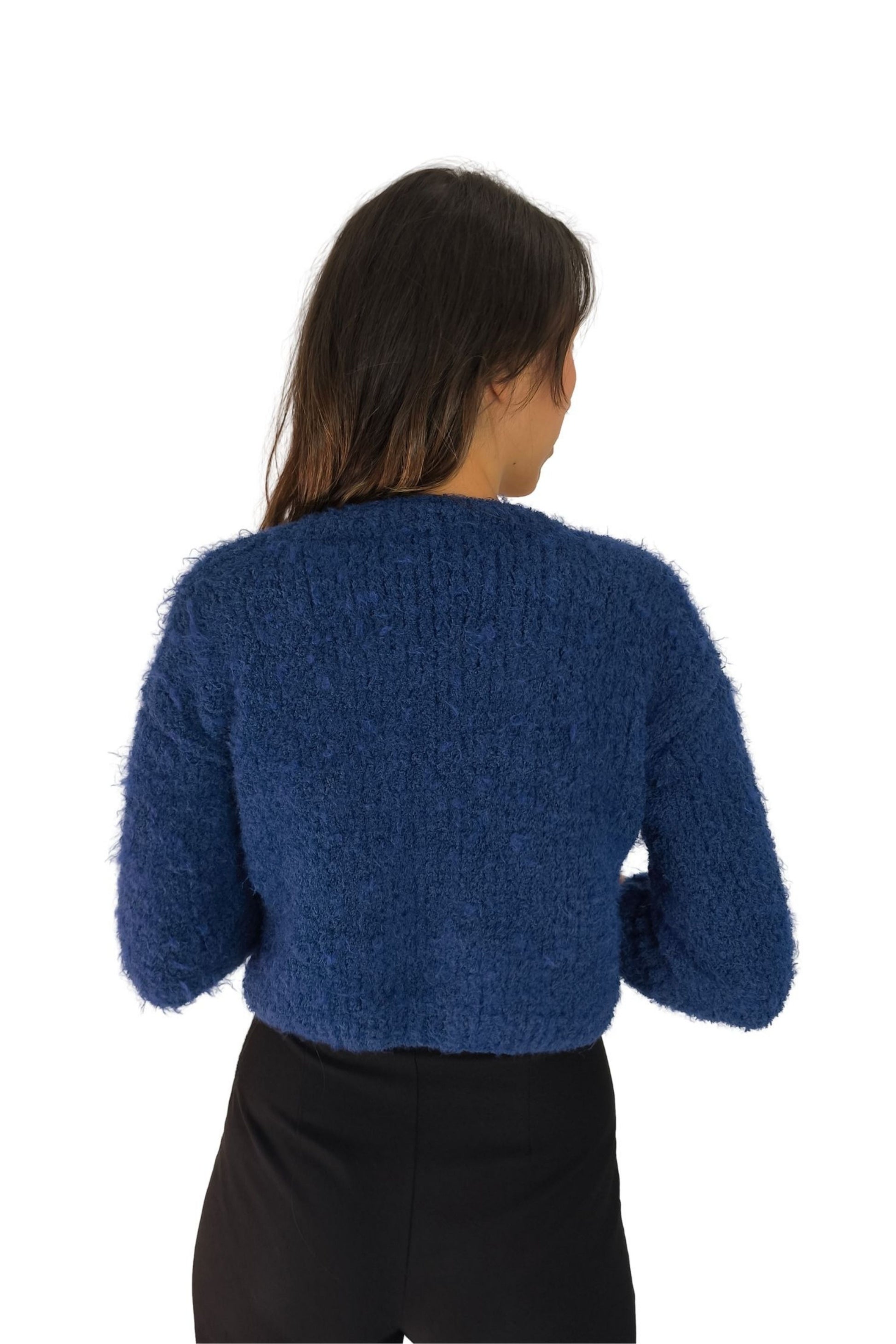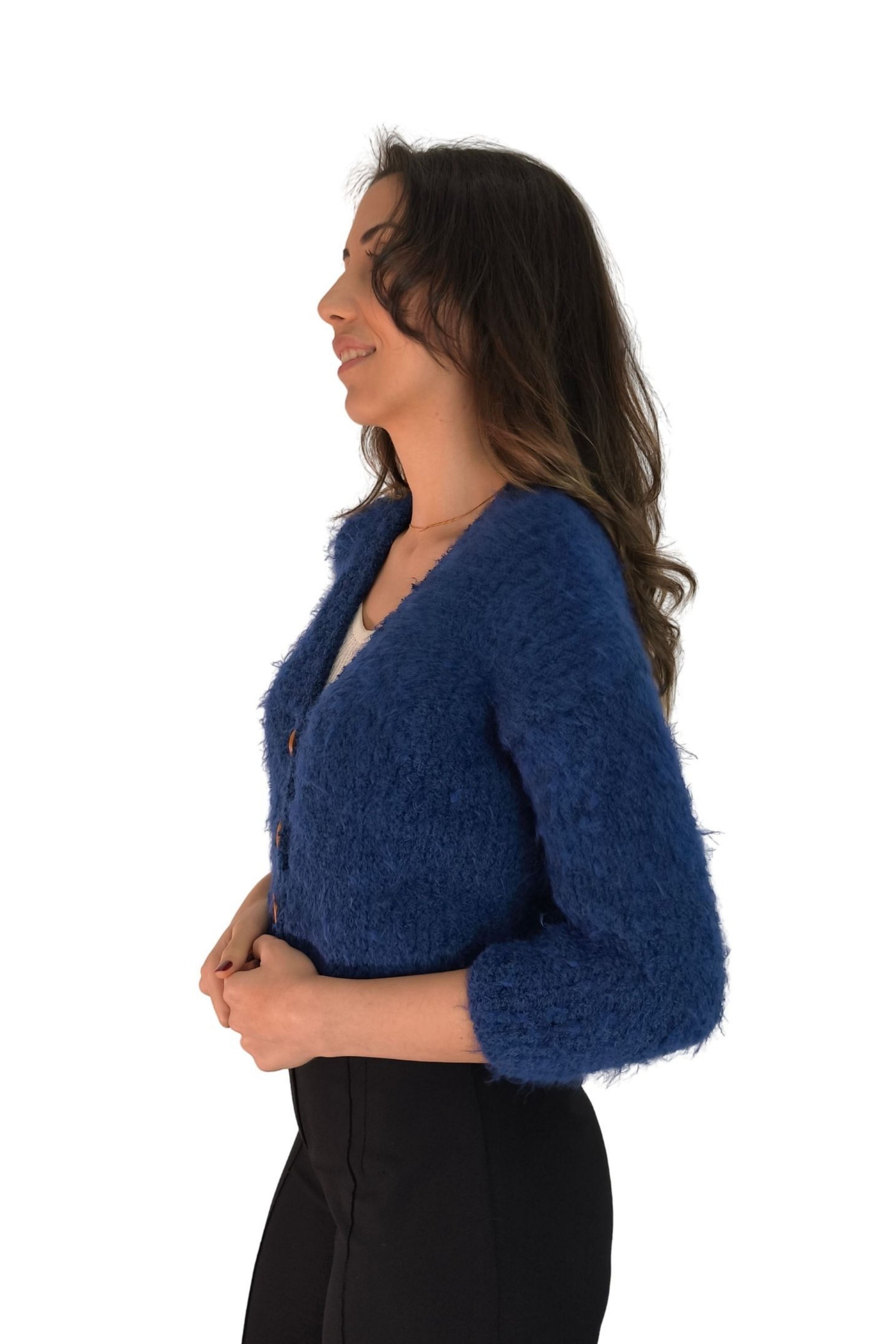 Lacivert Tüylü Crop Triko Hırka – Düğmeli Tasarım