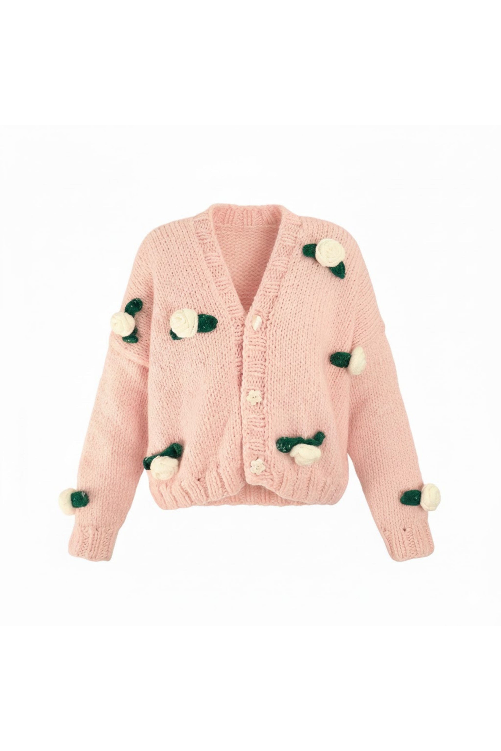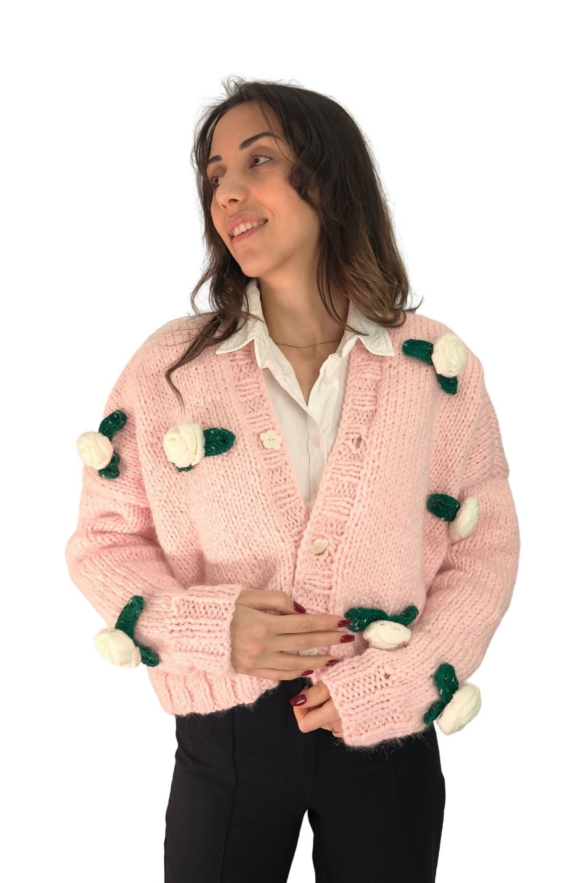 Pembe 3D Çiçek Motifli Triko Hırka